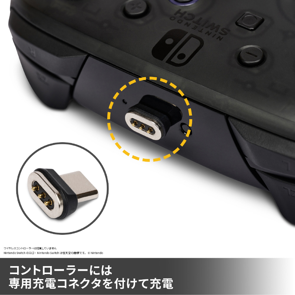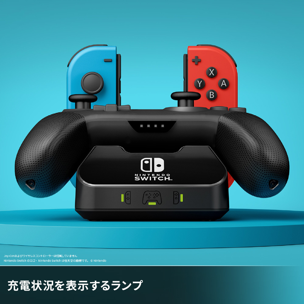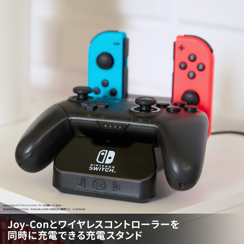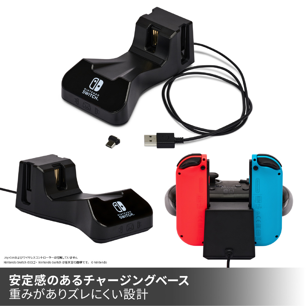 コントローラー・チャージングベースfor Nintendo Switchは任天堂ライセンス商品で、Joy-Conとワイヤレスコントローラーを同時に充電できるチャージングベースです。充電コネクターを使用することで、ワイヤレスコントローラーをチャージングベースにセットすることで同時に充電できます。充電中は充電ランプが赤色で点灯し、充電が完了すると緑色に変わります。