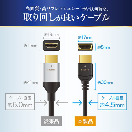 直径 約4.5mmと細く、取り回しの良い高画質HDMIケーブル!