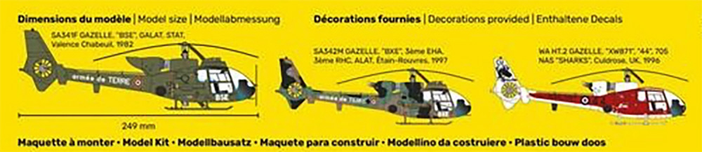 SA341F、342M、432L1、WA HT.2の各タイプを選択して組み立て可能。パーツ点数は57点、仕上がり全長は249mm、幅241mmで特徴あるテールのフェネストロンなどの形状をしっかりと再現しています。コクピットは計器パネルやシート、操縦桿など、細部のディテールも表現。タイプによる違いも再現。クリアパーツで構成されるキャノピーから見えるリアリティを高めています。機体側面にはロケットランチャーも装備。ヘリコプターならではのメカニカルな仕上がりも見逃せないキットです。マーキングはフランス軍、イギリス軍などから5種を収録。