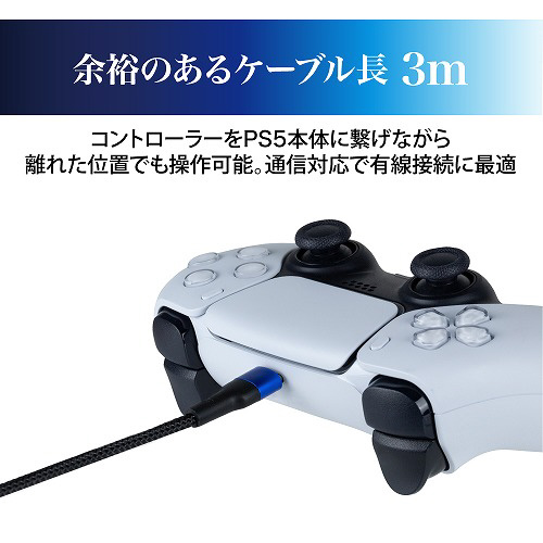 ケーブル長は約3mで、PS5本体から離れた位置でもコントローラーを操作可能。