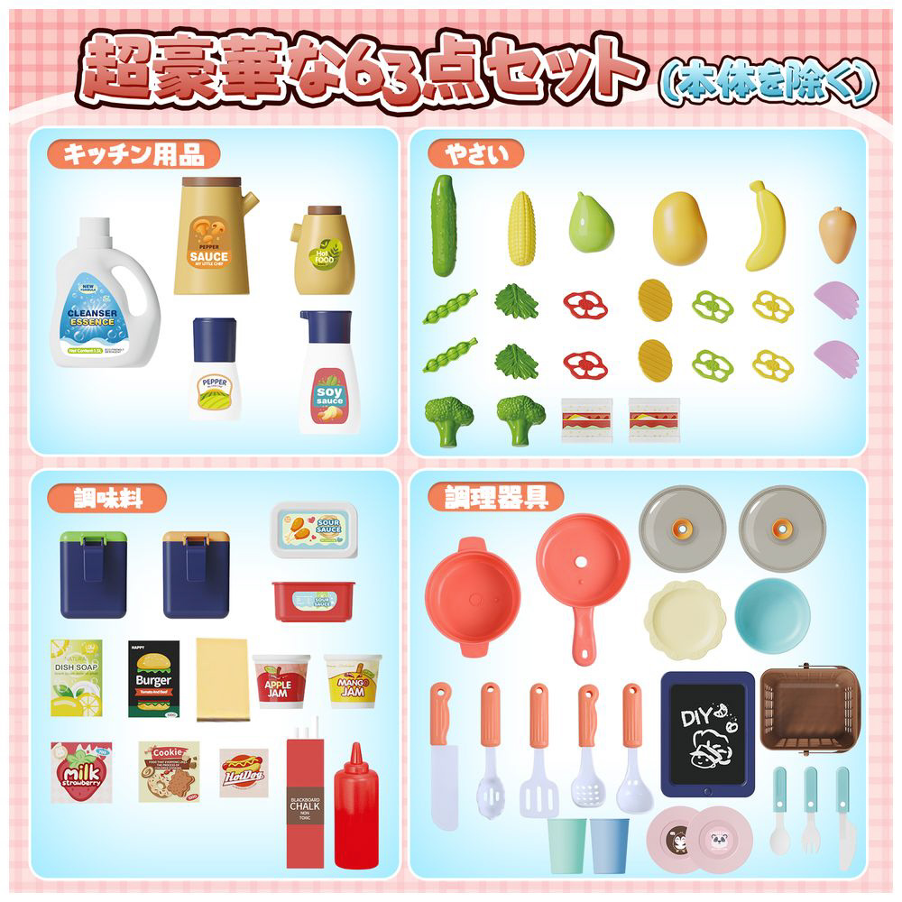 大きな台所本体・野菜・果物・調味料・キッチン用具・調理器具など、バリエーション豊な64点セットです。