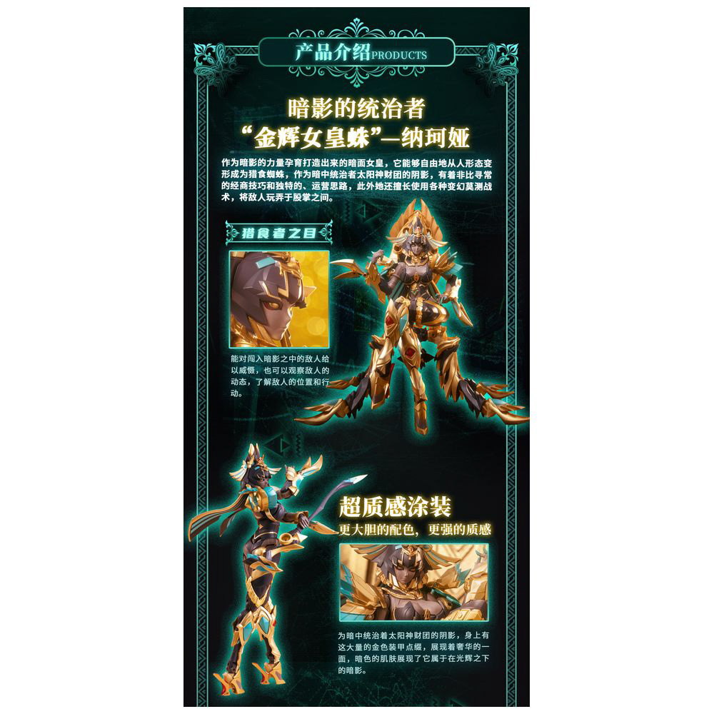肌はココア色に輝き、金色の装甲は豪華さの象徴。