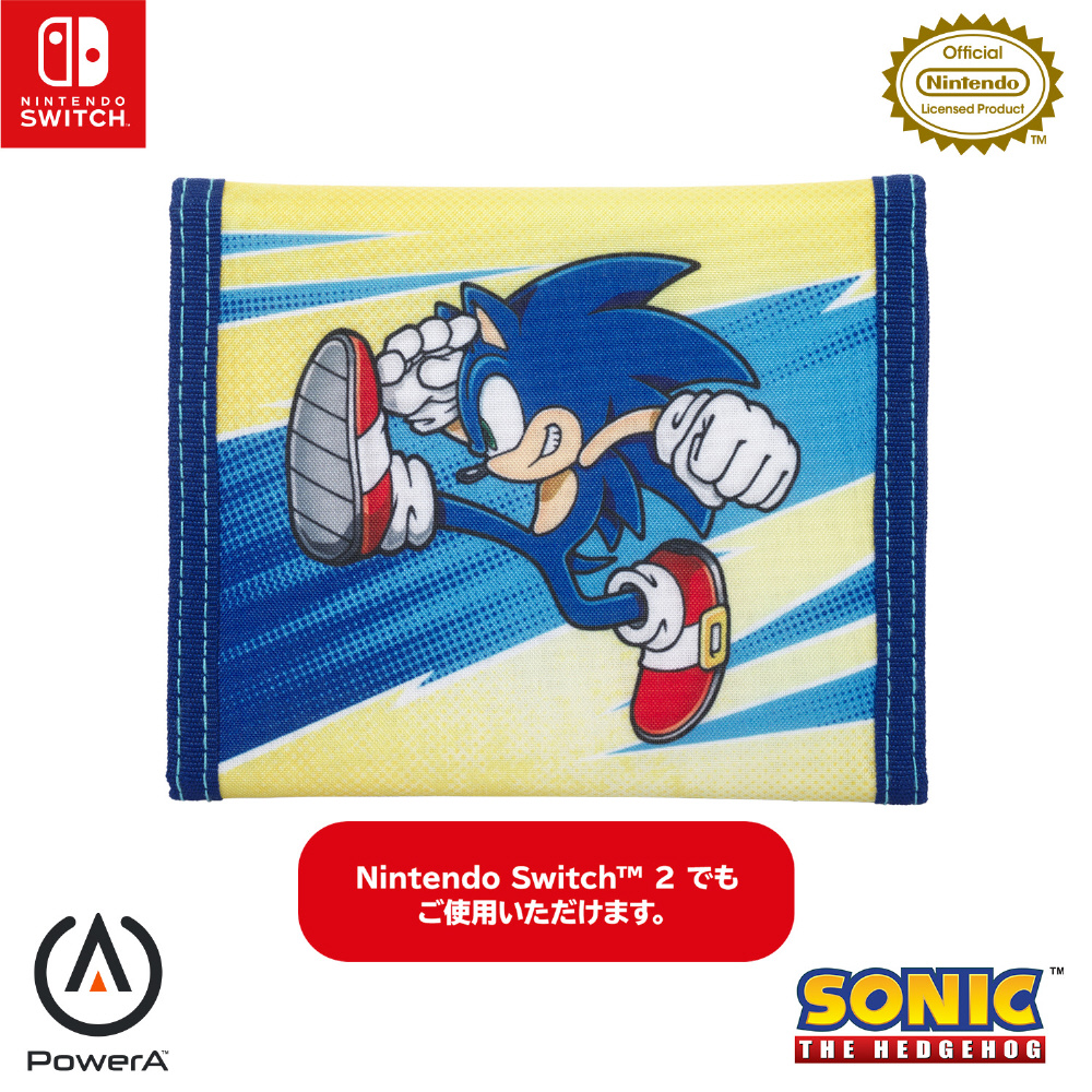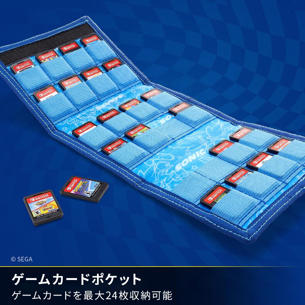 「ソニック」のクールなデザインをあしらったゲームカードホルダー。スタイリッシュでクラシックな三つ折りウォレット形式で、Nintendo Switch用ゲームカードをまとめられるコンパクトなケース。最大24枚のゲームカードを収納して安全に持ち運ぶことができます。紛失した場合に備えて、ネームカードとネームカードを入れられるクリアポケットが付いています。任天堂ライセンス商品。