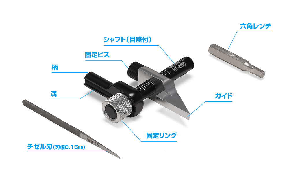 付属のチゼル刃は極細0.15mm幅の平らな刃先で、シャープな彫刻が行えます。また、別売の「HGマイクロチゼル単品」と交換することで、さまざまな線幅の平行線が彫刻可能。