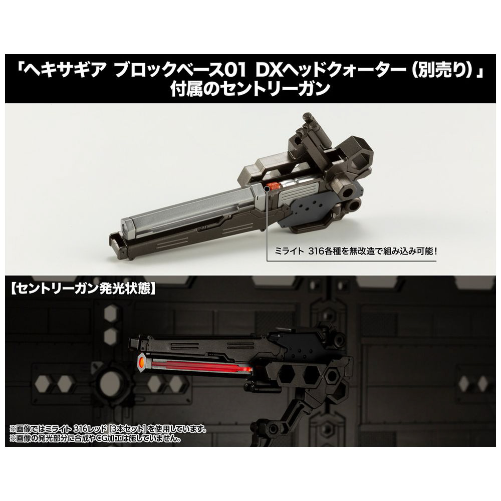 ■「ヘキサギア ブロックベース01 DXヘッドクォーター(別売)」に付属する「セントリーガン」は、ミライト316を無改造で組み込むことで、