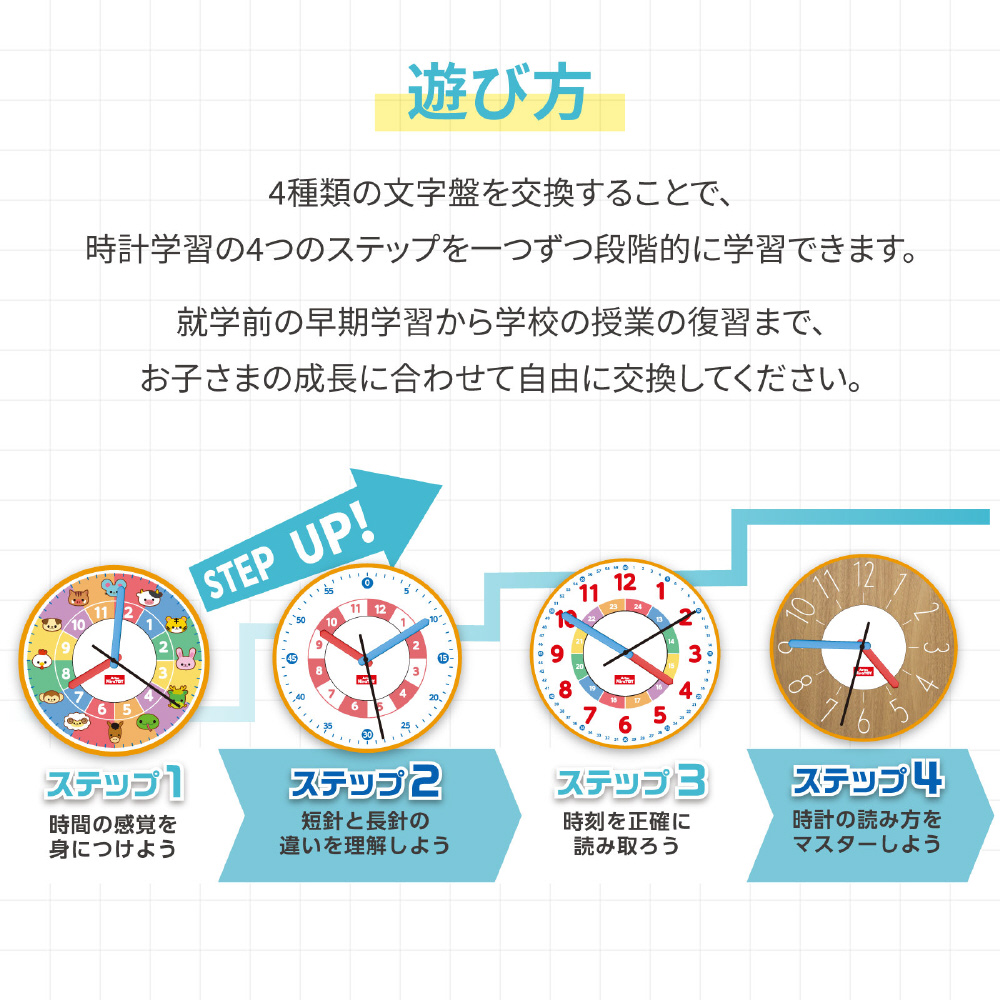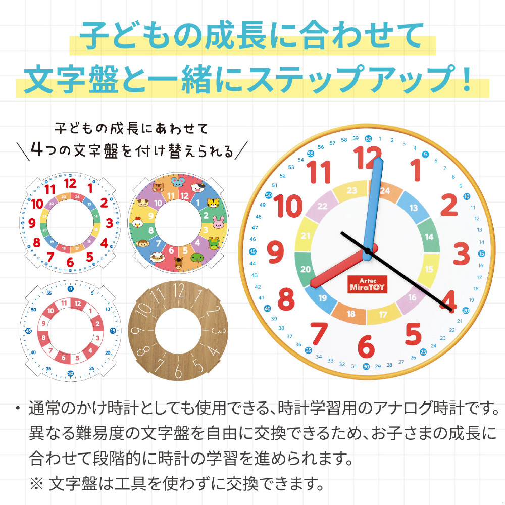 Artec MiraTOYシリーズの4ステップラーニングクロックです。子どもの成長に合わせて時計の学びを深めることができます。4つの文字盤を付け替えながら、楽しくステップアップしていきます。ステップ1:時間の感覚を身につける、ステップ2:時計の読み方をマスターする、ステップ3:時刻を正確に読み取る、ステップ4:短針と長針の違いを理解する。成長段階に応じた学びをサポートし、遊びながら時間の概念を楽しく習得できます。対象年齢:3歳以上。