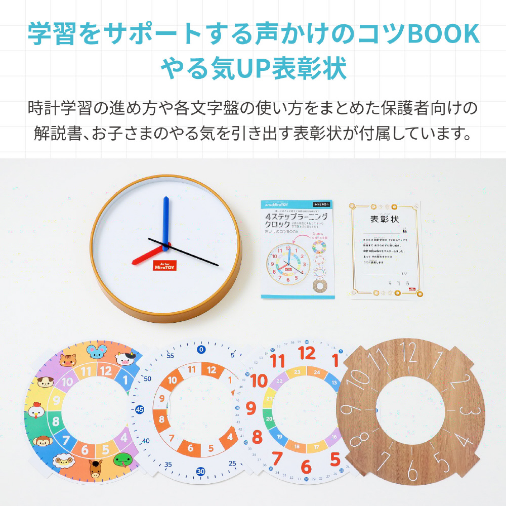セット内容:時計本体×1、文字盤×4、声かけのコツBOOK×1、表彰状×1