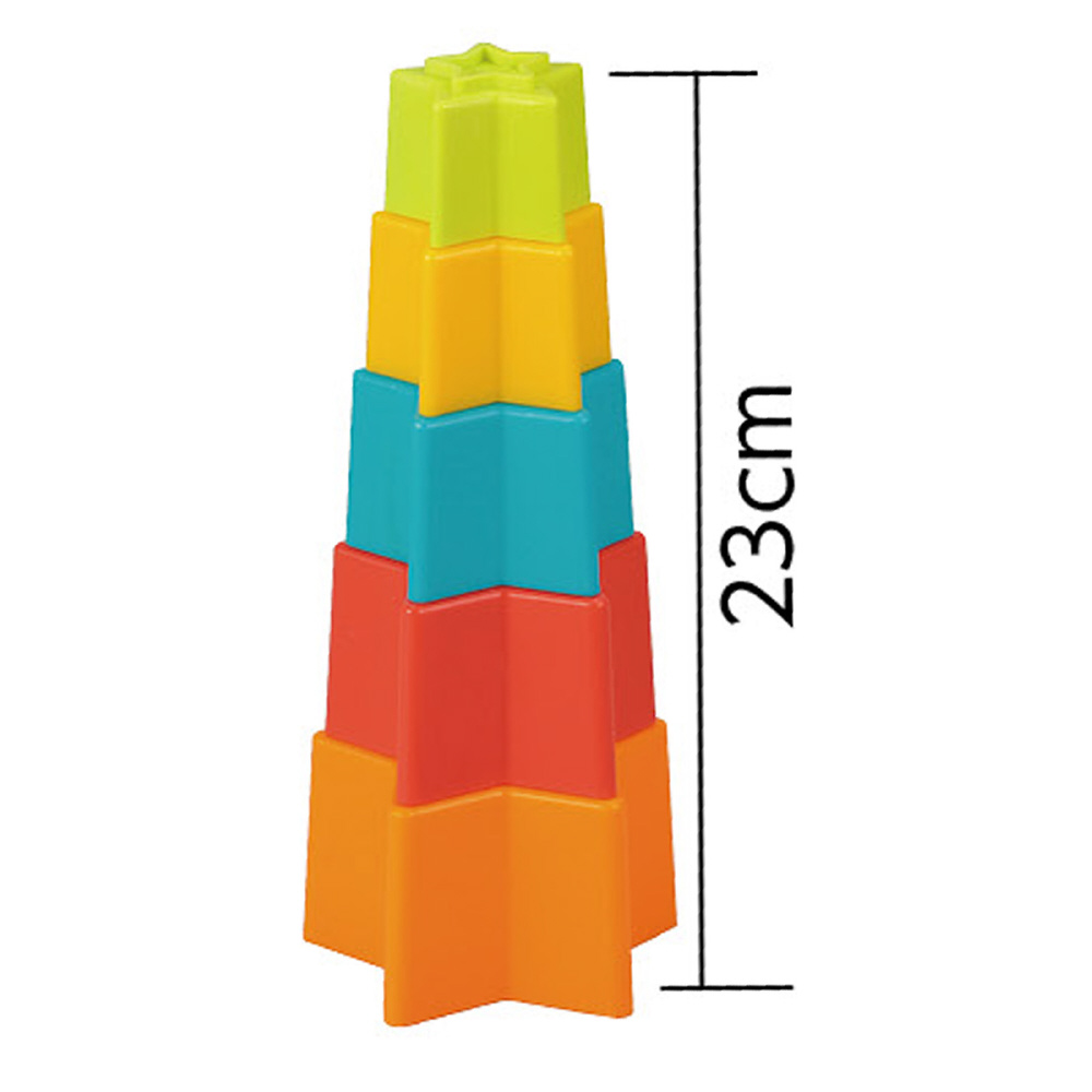 星形のカラフルなバケツで楽しく遊びながら学べる知育おもちゃ!バケツを重ねて高く積み上げて遊び、遊び終わったら簡単に片付けてコンパクトに収納可能。持ち運びしやすいのでどこでも楽しめます。小さなお子さまの手にぴったりなサイズ感で、集中力や想像力、さらに手先の器用さを育てるのに最適です。