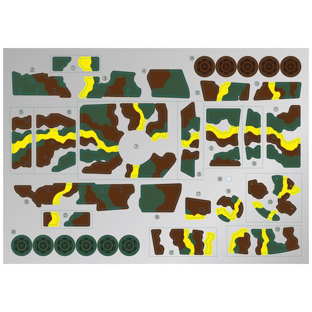 ■3色迷彩に黄色の帯を施した姿は、カット済みのリアルシールを貼り付けて再現することができます。