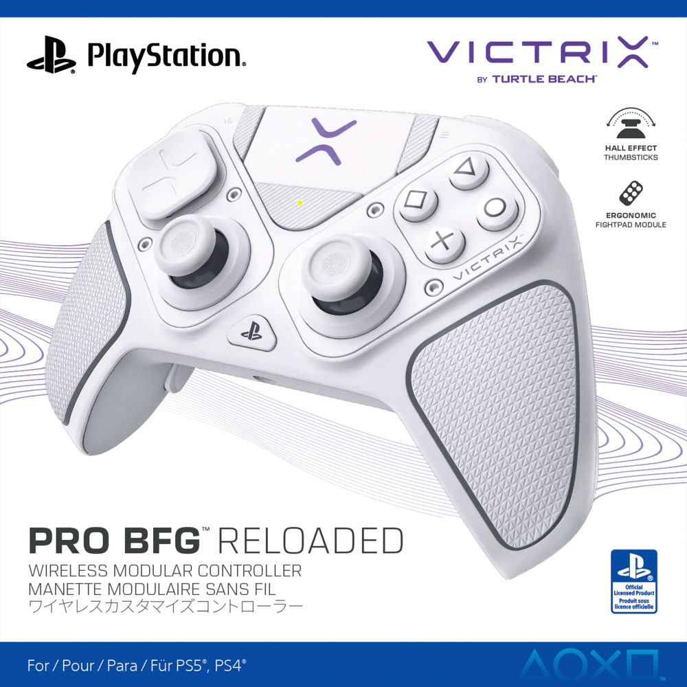 Victrix Pro BFG Reloaded ワイヤレスコントローラーはモジュール式を採用し、ホールエフェクト技術を採用したカスタマイズ可能なモジュール、Kailhマイクロスイッチを備えた6ボタンFightpadモジュール、マッピング可能なボタン、そして5段階調整可能なクラッチトリガーを搭載。PS4、PS5、PCでドリフトのない正確なプロレベルのパフォーマンスを提供します。