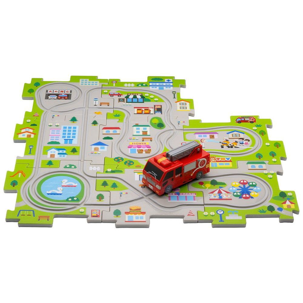 街中を描いた楽しい絵柄パネルを組み合わせて色々なコースが簡単に作れる、人気車両とパネル8 枚のセット