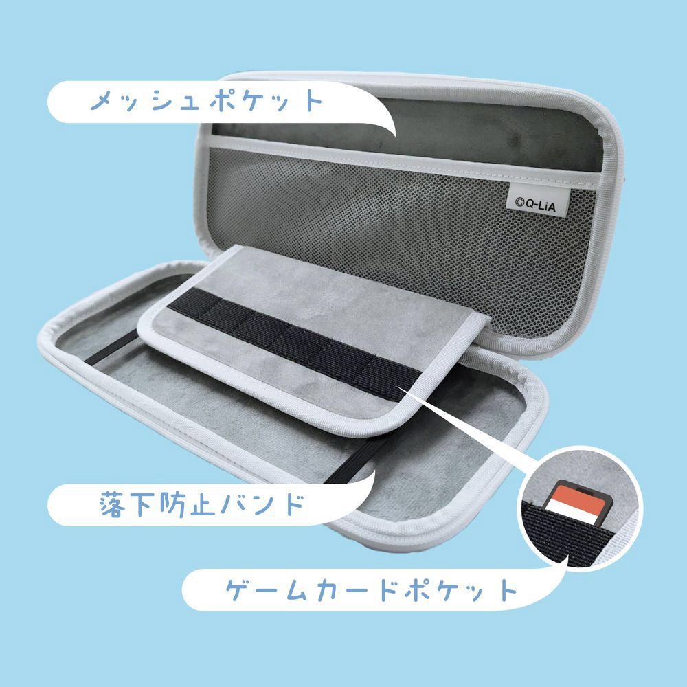軽くて丈夫なEVA素材を使用。薄型でコンパクトなのでバッグにも入れやすく、ゲーム機本体を固定するバンドも付いているため持ち運びにも安心です。