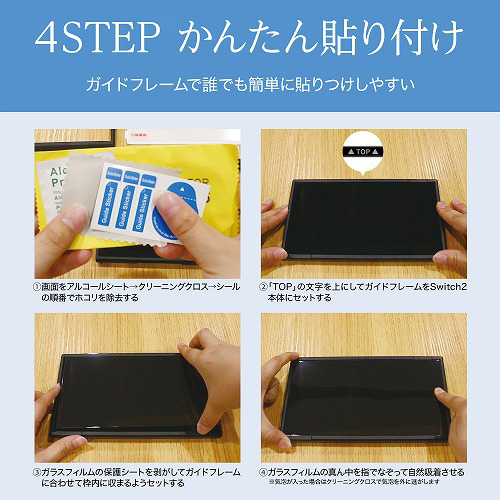 貼るのが苦手な方でもガイド付で簡単に貼り付け可能!ウェットシートやクリーニングクロスなども付属した貼りやすいSwitch2用 ガラスフィルム!