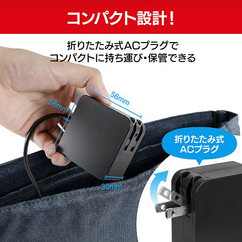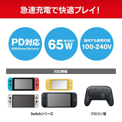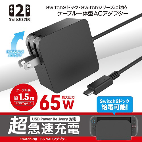 Switch2に対応した65W対応のACアダプター!ケーブルとAC一体型で折りたたみ式プラグを採用している為持ち運びにも便利!