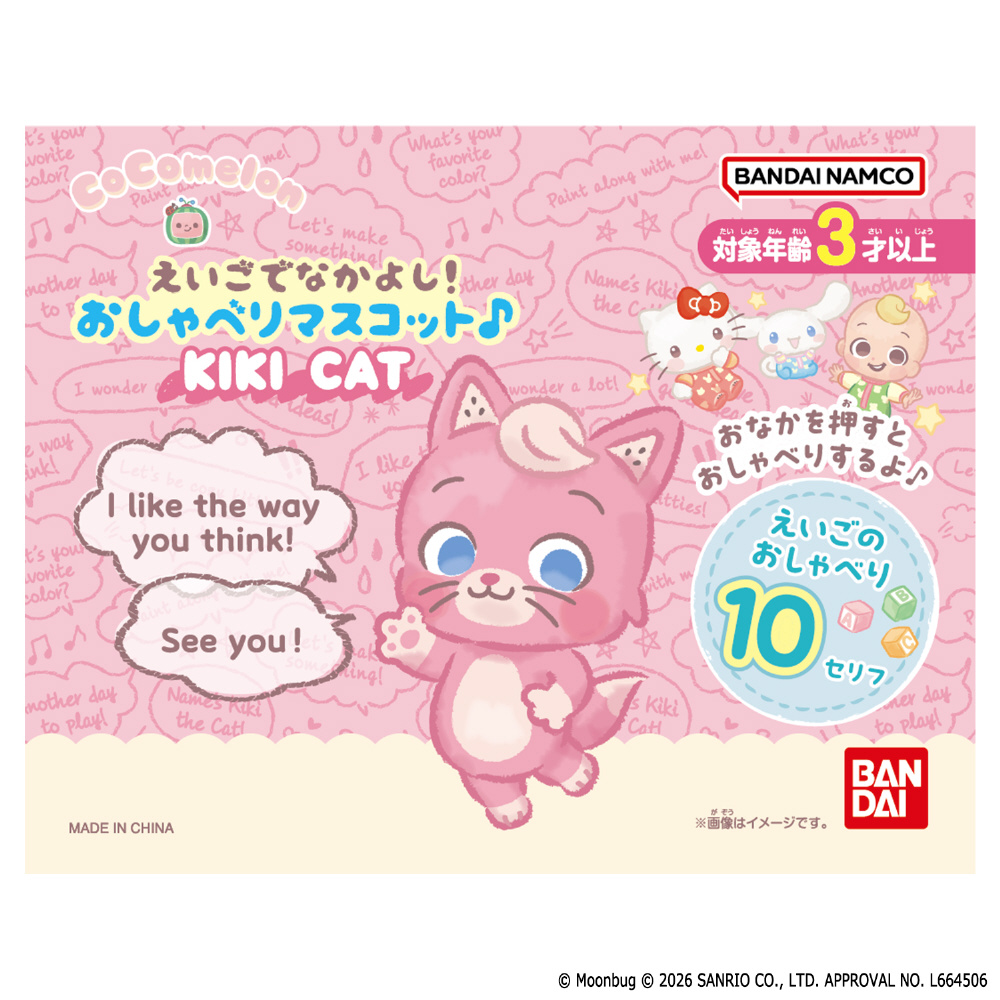 英語の歌やダンスを通して楽しく学べる、世界中で人気の幼児向けコンテンツ・CoComelonとサンリオキャラクターズのコラボレーションアニメ「CoComelon Playdates with Sanrio Friends」から、お腹を押すと英語のおしゃべりをするぬいぐるみが登場!!楽しいおしゃべりを10種類搭載。