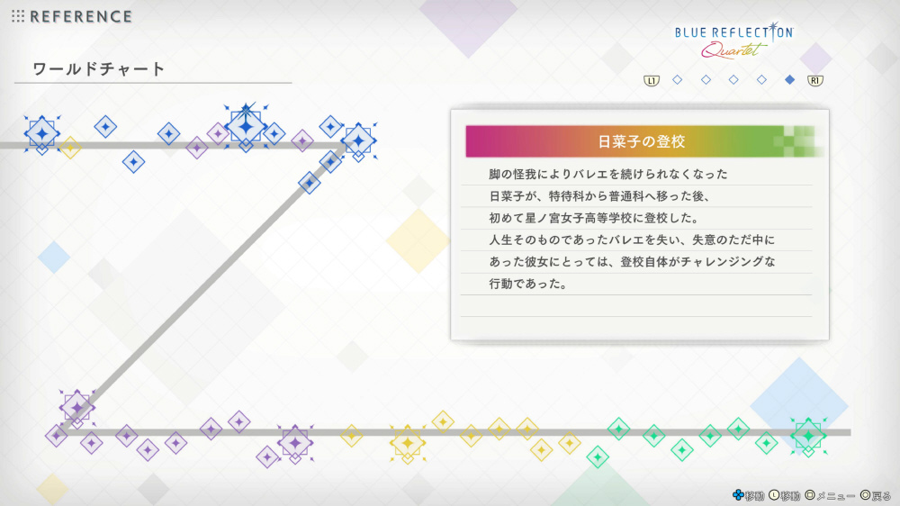 さらに「BLUE REFLECTION」シリーズに登場するキャラクターたちの相関図や、出来事のフローチャートなどが確認できるデータベース「REFERENCE」も実装。