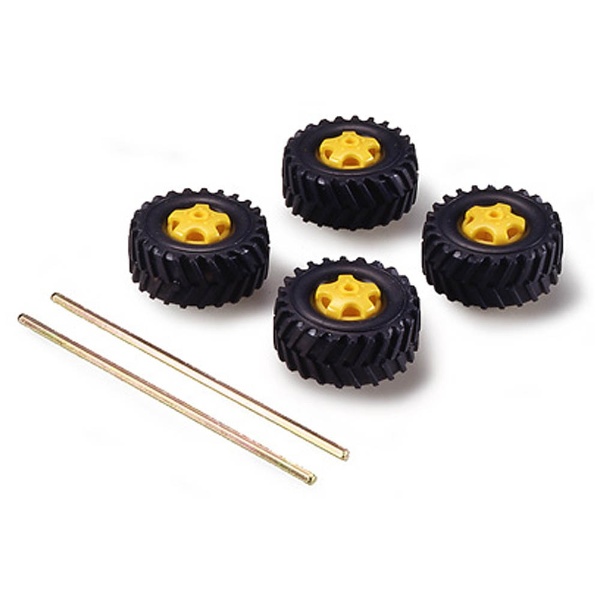 トラックやトレーラーなどの自動車工作に幅広く使えるホイール付きのタイヤを4本セットしました。ホイールは3速クランクギヤボックスやツインモーターギヤボックスと同じ六角シャフトタイプに対応。はめ込み式で手軽に取り付けられます。3×100mmシャフトも2本付いています。