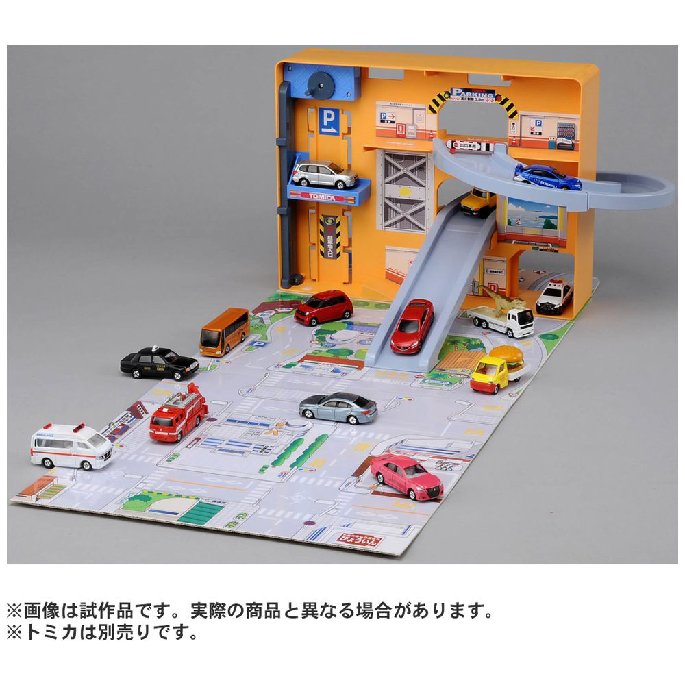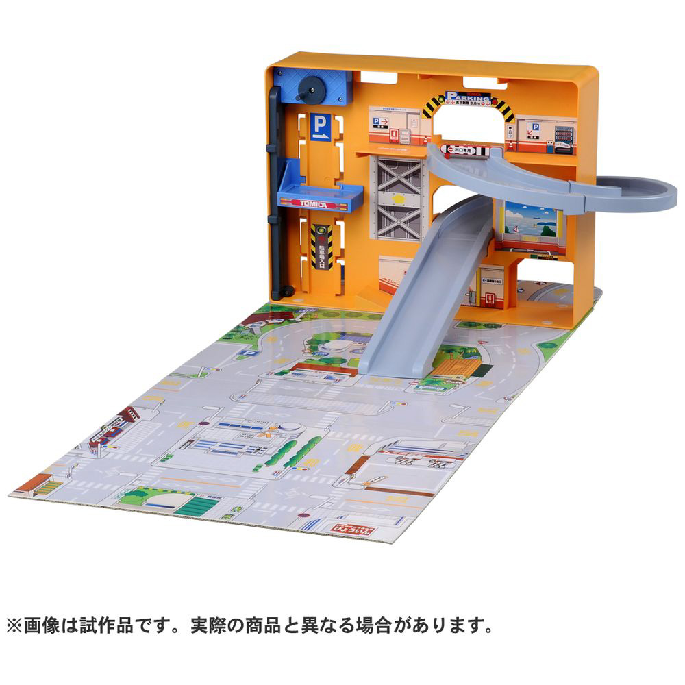 建物部分では、トミカをたくさん駐車したり、スロープをくるくると走らせたり、エレベーターの乗降遊びをすることができます。広げたマップでトミカの町遊びが楽しめます。