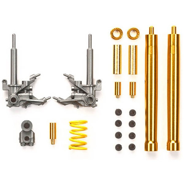 アルミ切削製のフォークアウターやリザーバータンク、金メッキ 加工を施した真ちゅう製フォークインナー、イエロー塗装済みコ イルスプリングなどをセット。