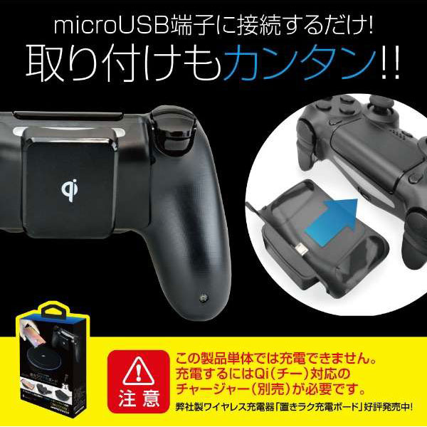 Qi対応の充電ボードに置くだけで充電できるPS4コントローラ用の充電レシーバーです。