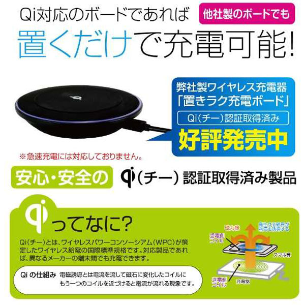 ワイヤレス給電の国際標準規格であるQi(チー)の認証を取得しているので、様々なQi対応デバイスとの互換性があり、安全性が高い製品です。