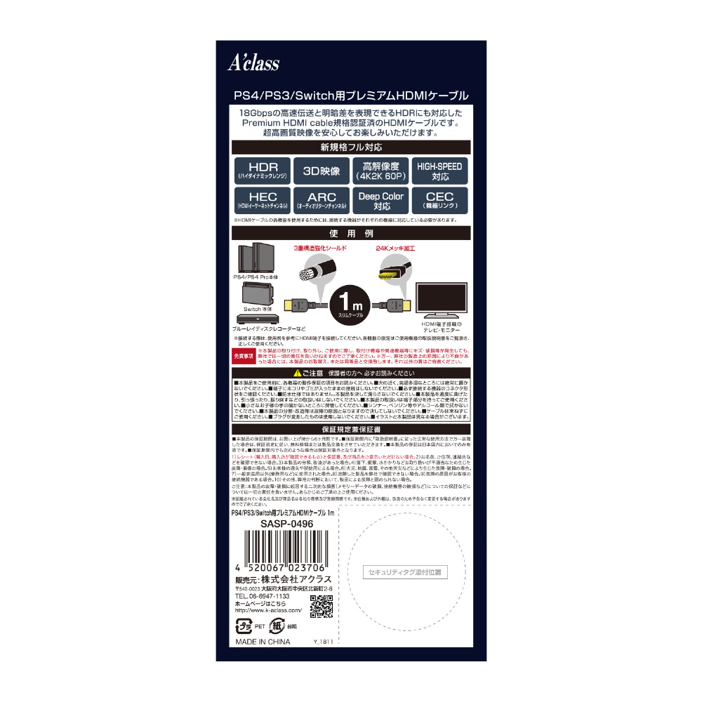 | 商品名 | PS4/PS3/Switch用 プレミアムHDMIケーブル 1m [SASP-0496] |