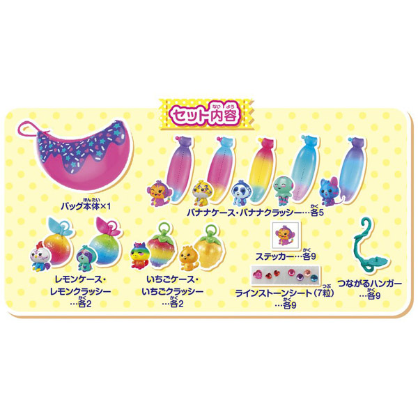 大きなバッグの中に、バナナーズ!5本、レモンフレンズ!2個、いちごフレンズ!2個、計9つのフルーツが入ったスペシャルセットです。