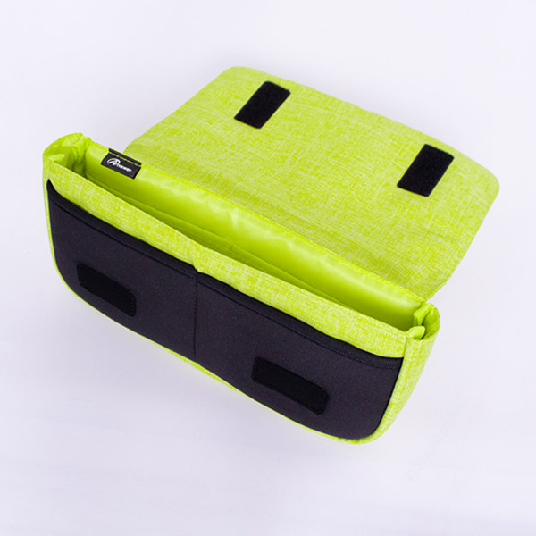 ポーチ内側に、ACやイヤホンなどの小物収納に便利なマチなしポケットが2つ付いており、フラップを開けたポーチ前面にはフロントポケットが2つ付いています。