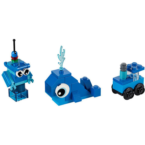 青のアイデアボックスのセットは、潮を吹いているクジラ、4輪の列車、アームが動くロボットなどを組み立てることができます