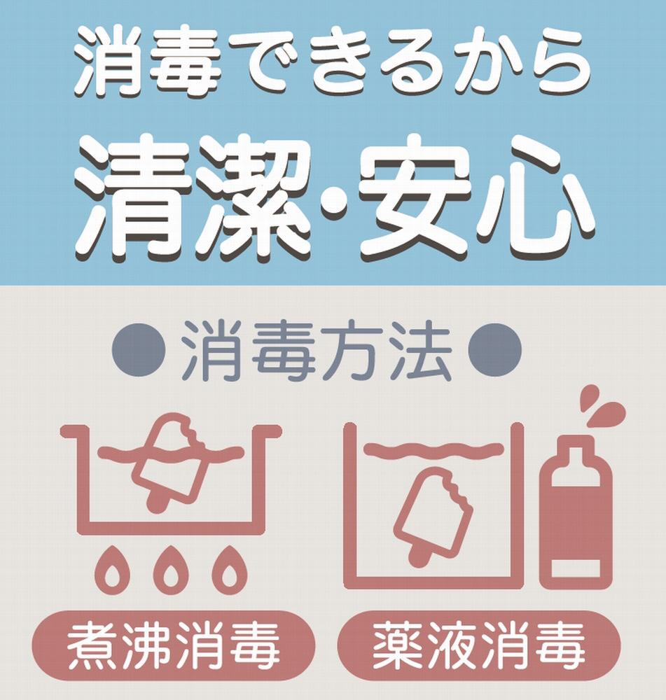 煮沸消毒・薬液消毒が可能です。