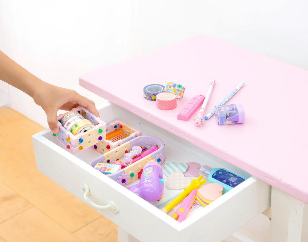 通常の板パーツとサイズも形も違うので、机回りの小物に合わせて収納にピッタリな作品を作ることができます。