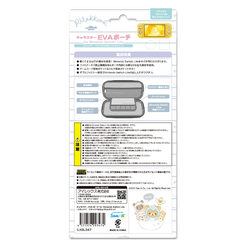San-Xの人気キャラクター「リラックマ(リラックマのきょうりゅうごっこ)」をあしらったかわいいEVA素材のニンテンドーSWITCH Lite用薄型セミハードポーチです。
