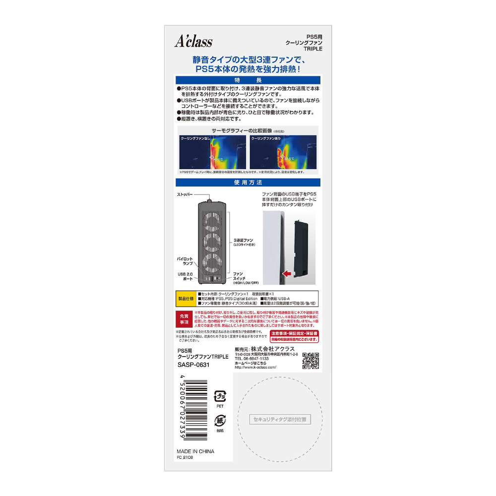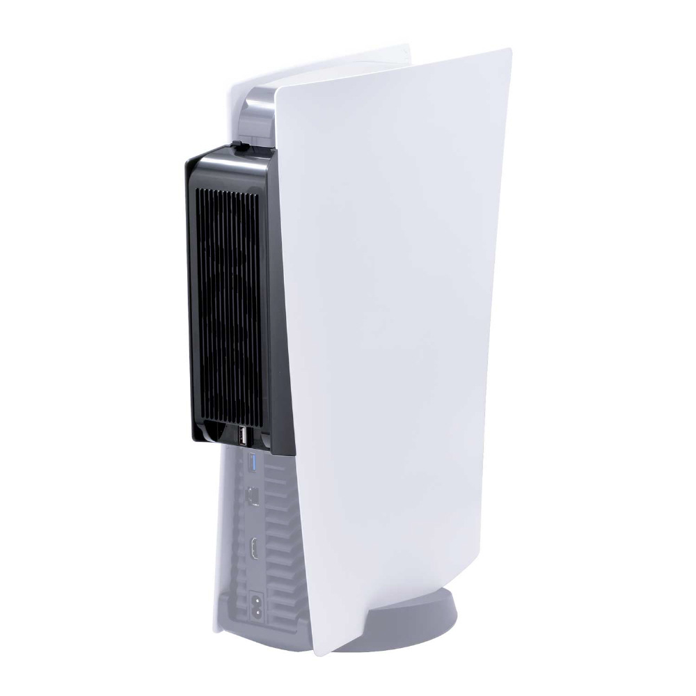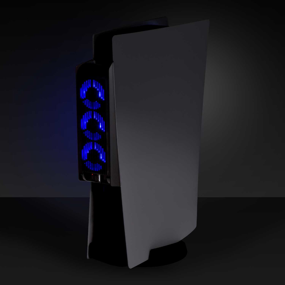 ●PS5本体の背面に取り付け、3連装静音ファンの強力な送風で本体を排熱する外付けのクーリングファンです。