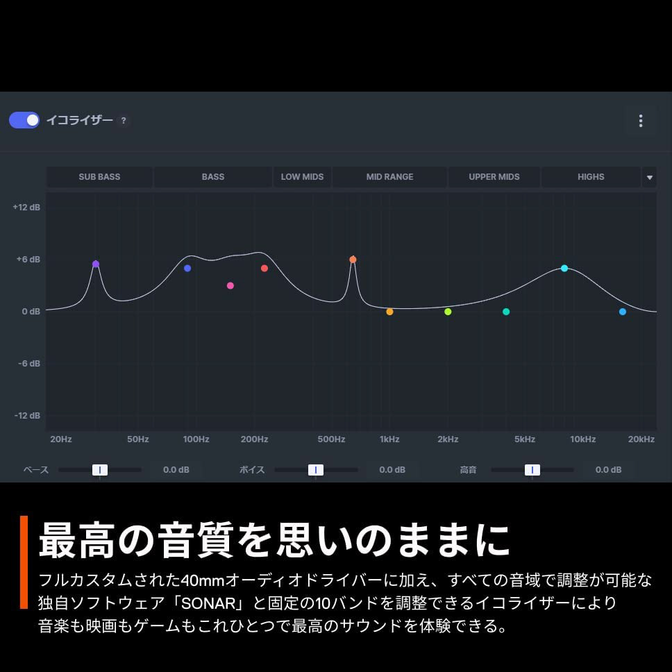 PlayStation 5の空間オーディオTempest 3Dに対応。PC接続時は、専用ソフトウェア「Sonar」を使用することで360°空間オーディオだけでなくプログレードのパラメトリックイコライザーもご利用いただけます。