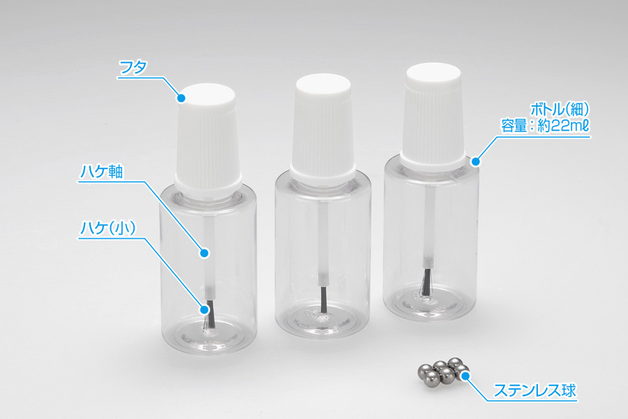 塗料やサーフェーサーなどを入れて、ボトルからそのまま塗りつけが可能。ボトルは透明で軽量なPET素材となっており、お好みの塗料やサーフェーサーなどの液体の材料を入れることができます。ボトル内の材料をかくはんするのに便利なステンレス球が6個付属。リニューアルに伴い、パッケージをブリスタータイプに変更しました。