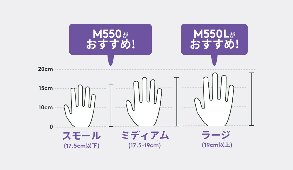 M550は標準モデルのM650からカスタマイズ可能なサイドボタンを取り除いてシンプルにしたモデル。定番機能はそのままに、ロジクールならではのクオリティをよりシンプルに提供しています。