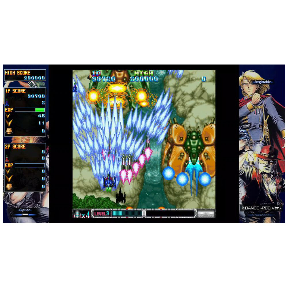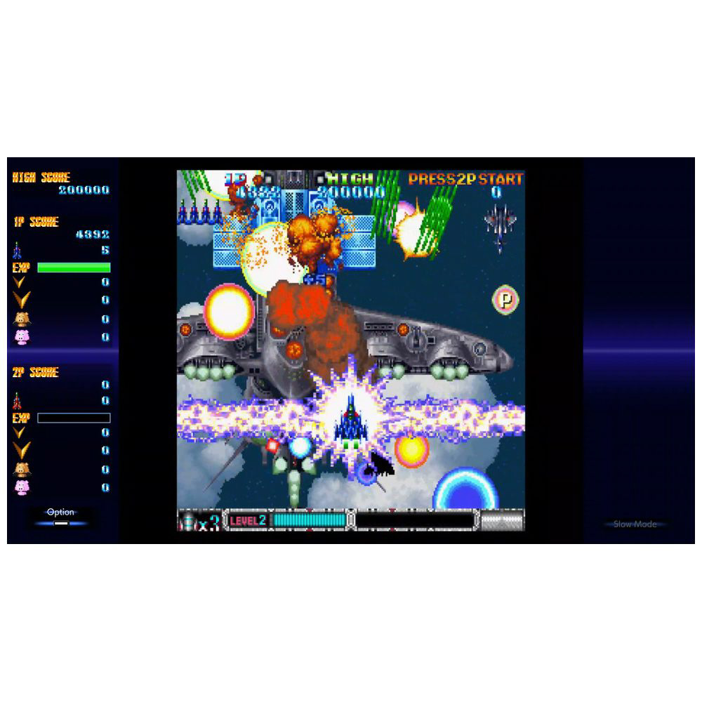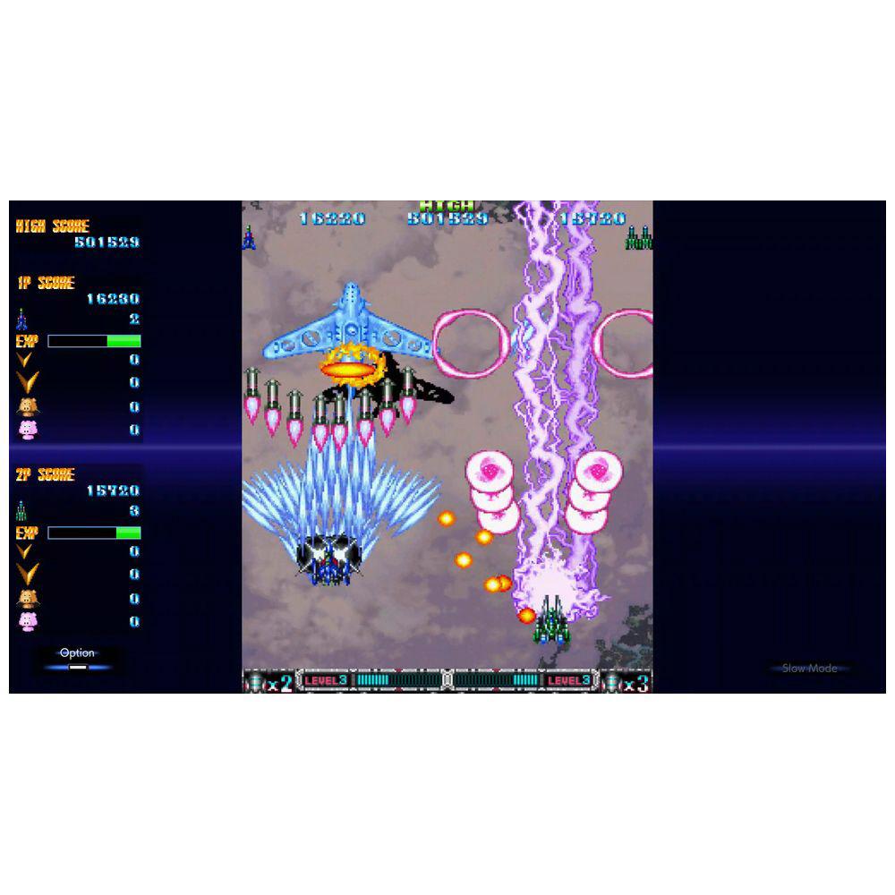 敵味方大量の弾が画面上を覆い尽くすド派手な迫力が話題を呼びました。後に登場したマイナーチェンジ版「スペシャルバージョン」とアレンジ音源が追加された最終形態ともいえる家庭用バージョンをもとに、本作はさらに新機能を追加。