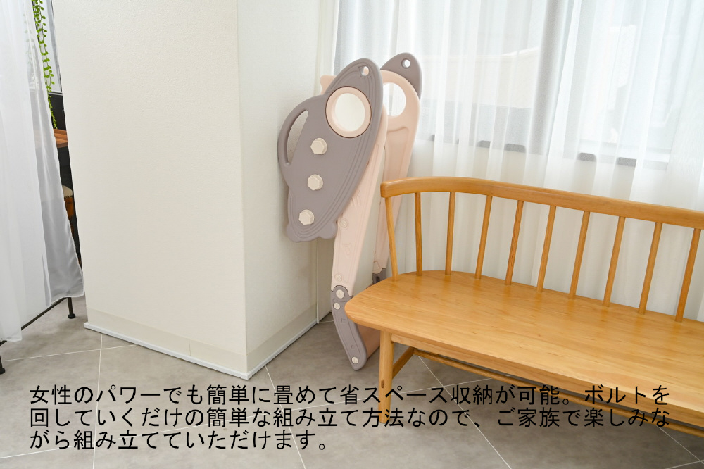 <p>◆おうちでアクティブに遊べるスライダー。サイドのデザインがロケット型になっており、ところどころ宇宙のモチーフが。他にはないデザインです。</p><p>◆お部屋で遊ぶのに“ちょうどいい”コンパクトなサイズ感。安定感は抜群なので、安心して遊んでいただけます。</p><p>◆おしゃれなマット質感。さらっとなめらかな触り心地で、お子さまが手で触ってもべたつかず、お手入れも簡単です。</p><p>◆女性のパワーでも簡単に畳めて省スペース収納が可能。ボルトを回していくだけの簡単な組み立て方法なので、ご家族で楽しみながら組み立てていただけます。</p>