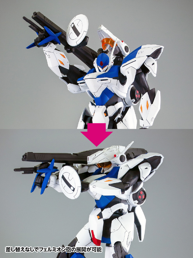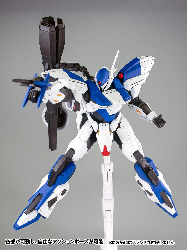設定画や劇中イメージを元に、鋭角的なエッジの効いたデザインにアレンジして製品化。成型色を7色のランナー成型色で、塗装しなくてもキャラクターイメージに近い仕上がりとなるようなパーツ構成としました。全高220mmの大ボリュームで、各関節部は可動範囲が広くさまざまなアクションポーズをとらせることが可能。メイン武器の「フェルミオン砲」は差し替えなしで展開ができ、劇中同様の発射体勢も再現できます。