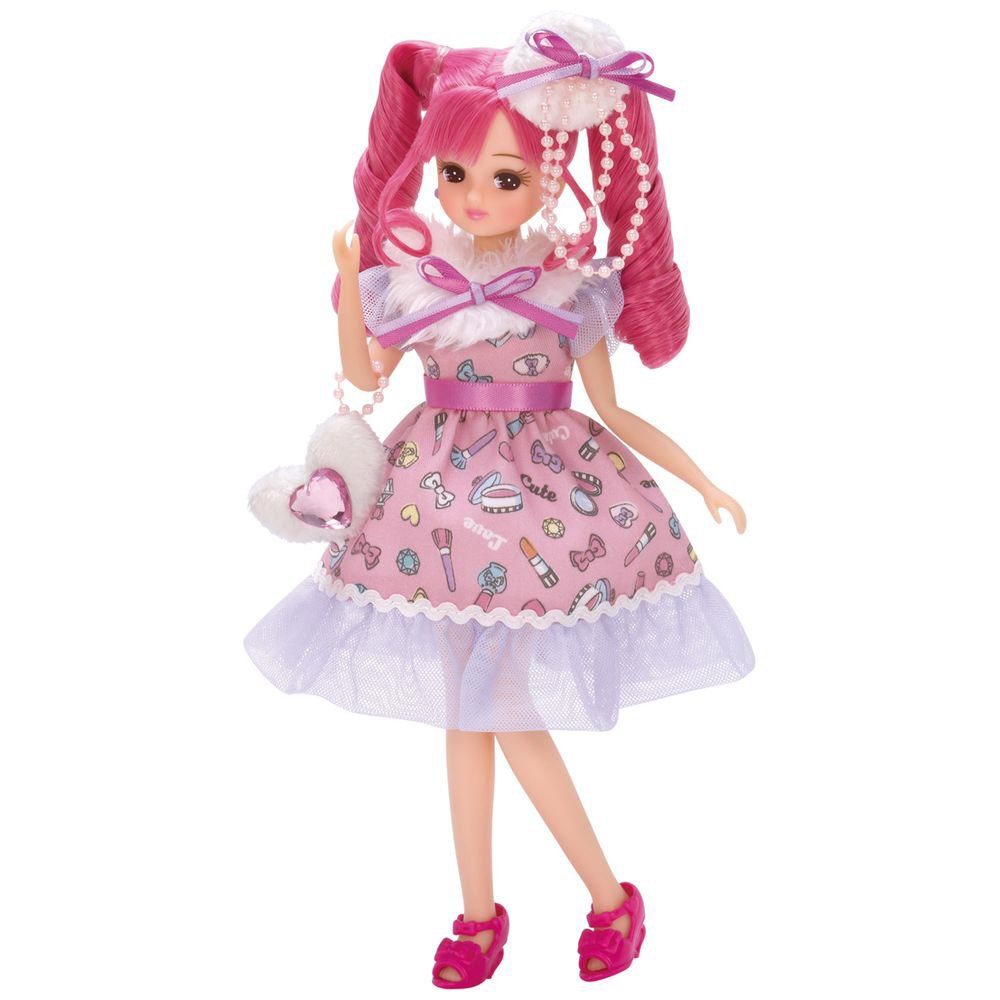 コスメ柄のワンピースがキュートなピンク色のスペシャルヘアカラーのリカちゃんです。