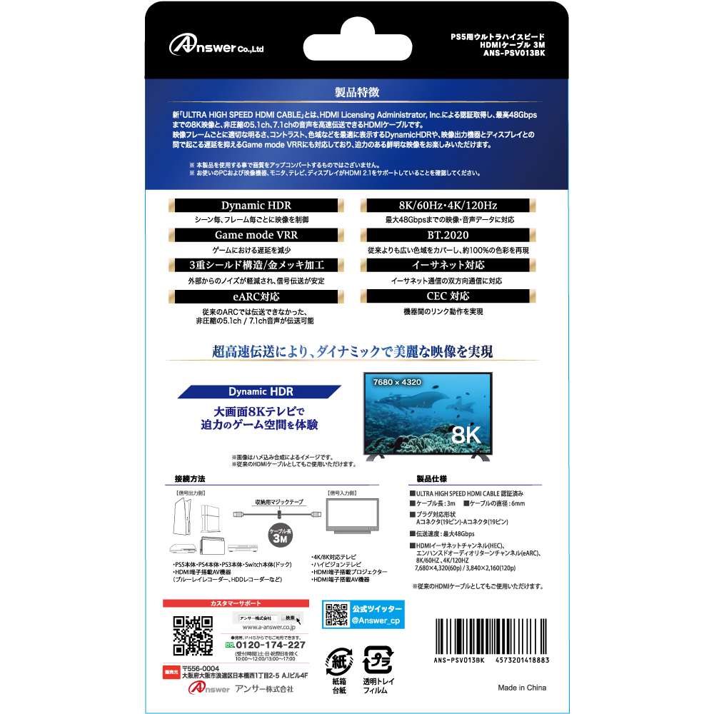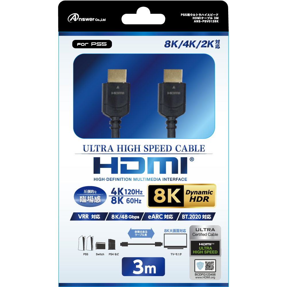 PS5用 ウルトラハイスピードHDMIケーブル 3M【ULTRA HIGH SPEED HDMI CABLE規格認証取得】