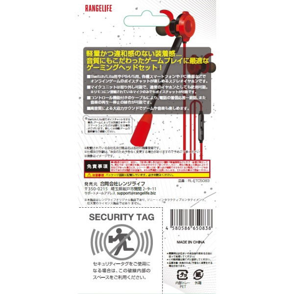 | 商品名 | 着脱可能マイク付きゲーミングイヤホン レッド RL-ETC5083 |
